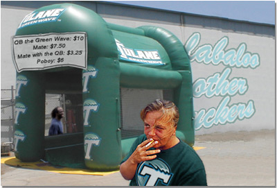 A carnie waits outside the "Hulabalooty Booty Booth," where Tulane auditions its next Patrickshaun Ramseyking. Oh, and serves a pretty good poboy but man you would think they could cut back on the horseradish in that remoulade they probably relied on the carnie's taste buds and that's a bad idea because a carnie's tongue is like a wet shoe insole dusted with sand you can use it to distress old furniture which makes sense because if you've ever seen carnie-tongue you'd be distressed too. |
