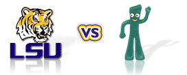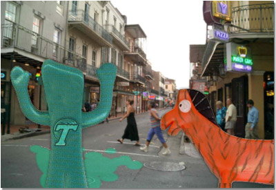 With Pokey painted like a Tiger to celebrate the game, Gumby makes a triumphant return to Bourbon Street to relieve himself make "Green Waves" for the fans. You can really see how pumped up the fans are in this photo. This was taken just before Pokey disgorged the 63 Luck Dogs he'd consumed earlier that morning. Take that, Nathan's hot-dog-eating-Japanese-guy. |