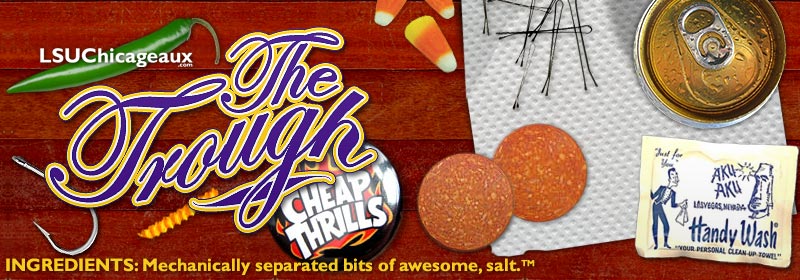 Welcome to The Trough, a place that really gets to the meat of LSU's opponents. Ok, not so much the meat, but the sinewy gristle and thick connective tissue. We then feed these funbits through a grinder to get a coarse meaty bounty, and that's what is on display here. It should be a given that while The Trough is loosely related to LSUChicageaux.com, it's more like a Baton Rouge uncle than a Tuscaloosa cousin. In other words, what's in The Trough is obviously not endorsed by any official LSU entity. They've got better sense than that.