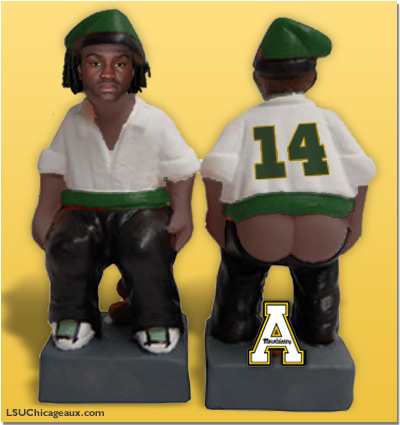 Just like "engineers" are "people who make engines," the term "mountaineers" comes from people who make mountains. We couldn't find any documented mountain-making by people, so we figured it was a euphemism. We did find an illustration of "people who make mountains" - caganers, popular Catalan Spanish Christmas figurines depicting people relieving themselves. These figurines are then placed into the Nativity. What better way to say "Happy Birthday, Jesus!" than to have a small figurine soiling the labor and delivery barn? After this game, LSU licensing will approve the Danbury Mint Armanti caganer, so you too can relive the 2nd quarter, every single Christmas.